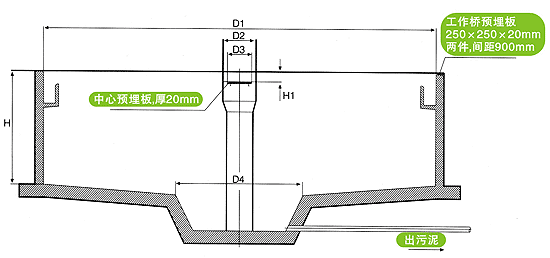 固定在旋轉(zhuǎn)豎架上的刮臂在驅(qū)動裝置帶動下,繞池中心軸線旋轉(zhuǎn),將沉積在池底的污泥由刮泥板刮集至池中心集泥坑,同時,液面上的浮渣向隨導(dǎo)流筒旋轉(zhuǎn)的撇渣板和周邊浮渣擋板形成的漸縮區(qū)域內(nèi)集中,直至其封閉邊—刮渣擺臂。當(dāng)擺臂抵達(dá)集渣斗時,由擺臂上的刮渣板刮集至集渣斗排出池外。